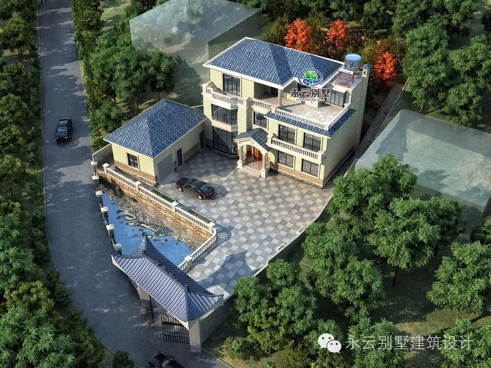 外观效果图欣赏,业主喜欢简洁素雅风格的色彩搭配,屋顶太阳能水塔平台、内外大露台、院子里杂屋间、车库,院前荷塘鱼池,别墅后花园一应俱全,这可是品质生活的标配哦